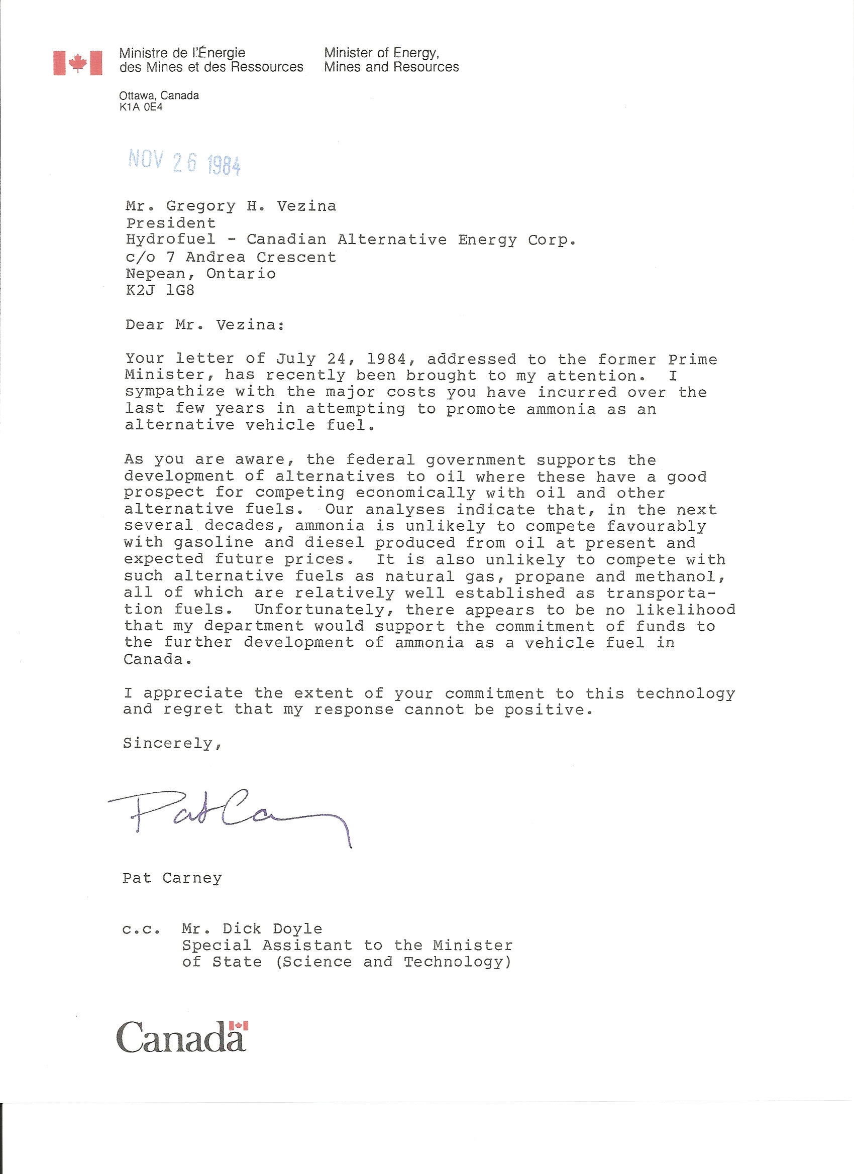 Your letter of July 24, 1984, addressed to the former Prime Minister, has recently been brought to my attention.  I sympathize with the major costs you have incurred over the last few years in attempting to promote ammonia as an alternative vehicle fuel.